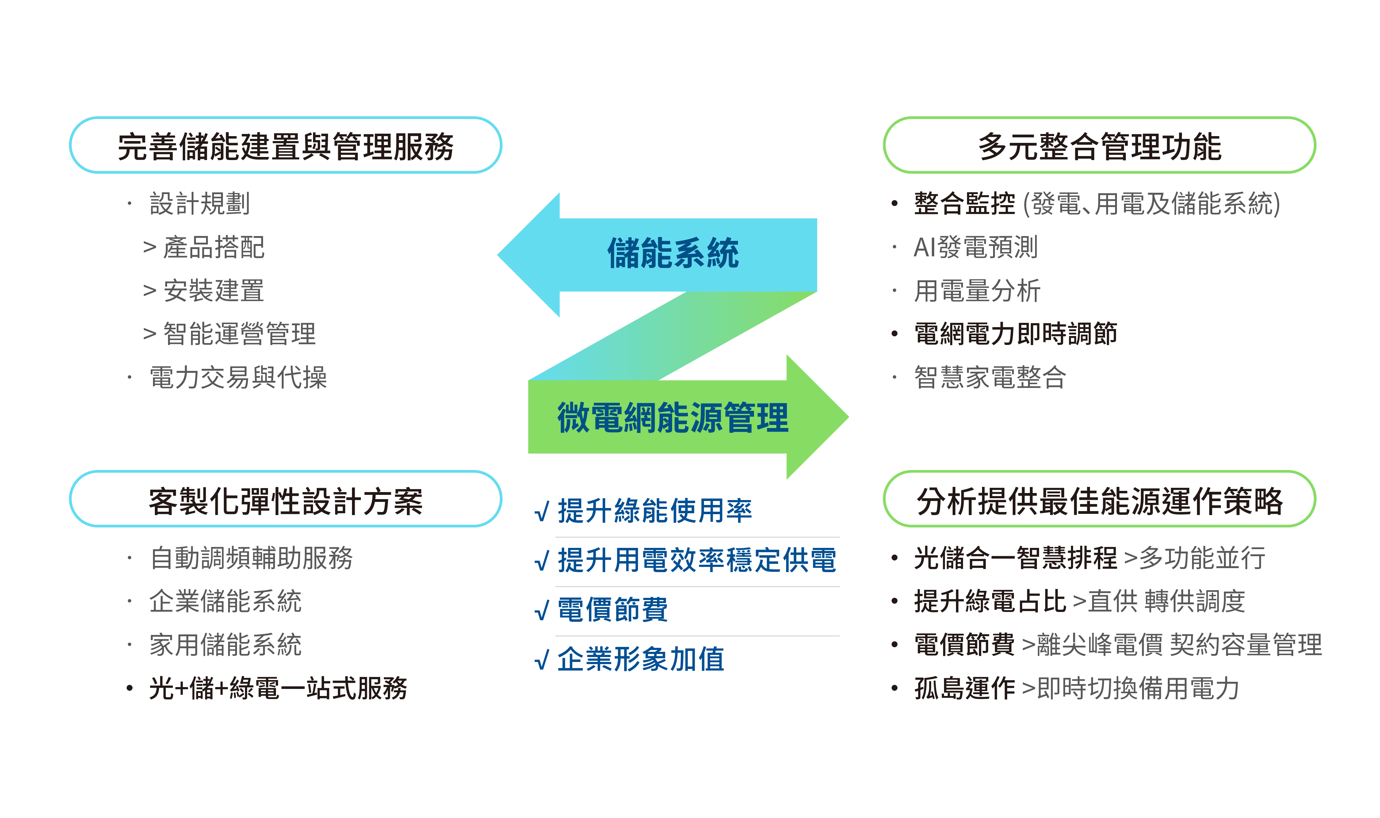 因應企業減碳需求,有效整合綠電建置、轉供與儲能及能源管理,協助客戶達到減碳目標。