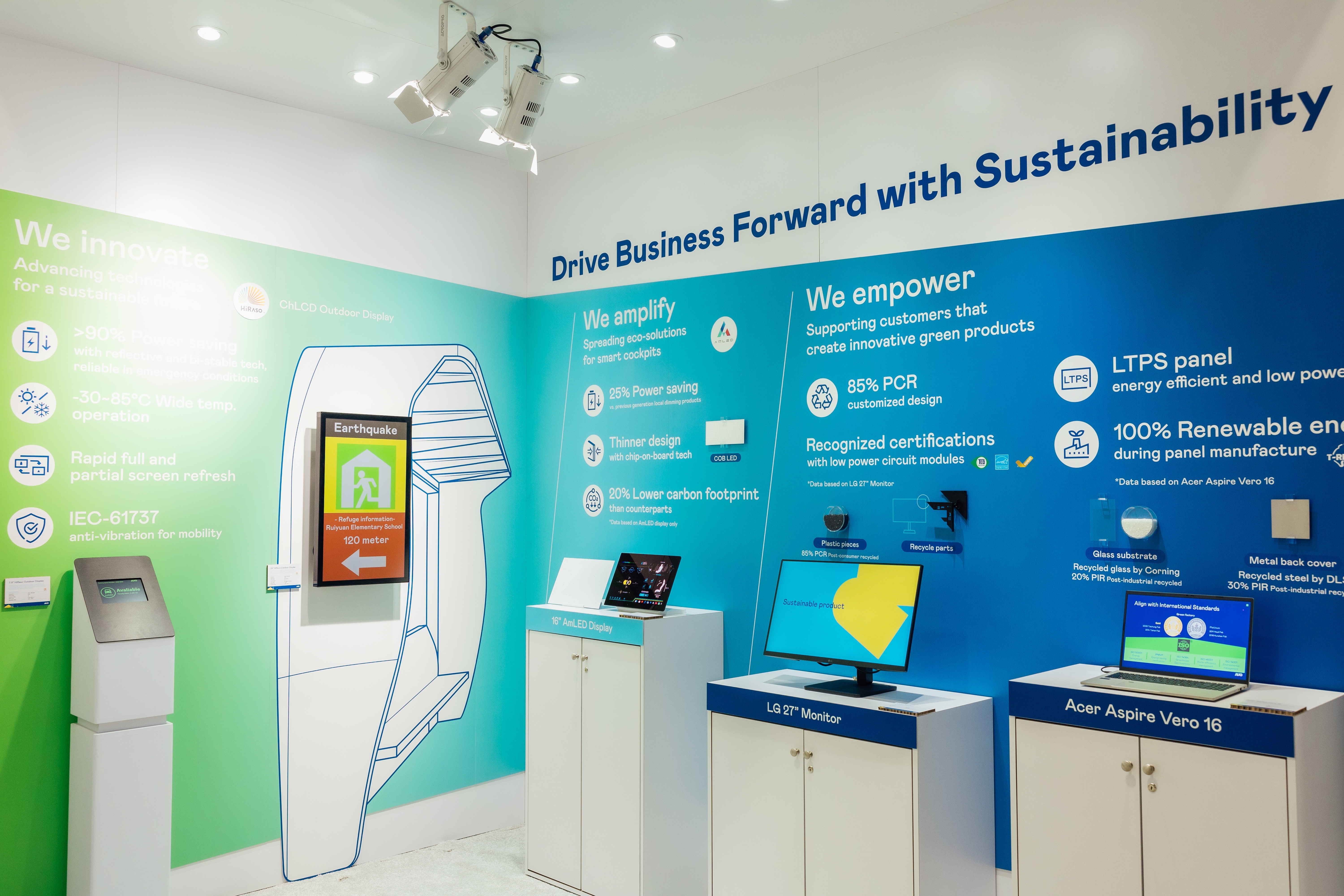 友达运用创新显示技术HiRaso胆固醇液晶双稳态技术达到显示零耗能、扩大节能省电的AmLED显示技术应用于车用产品、以再生的消费后回收(PCR)塑料及全绿电生产之面板,应用于笔电及萤幕,增加绿色价值。