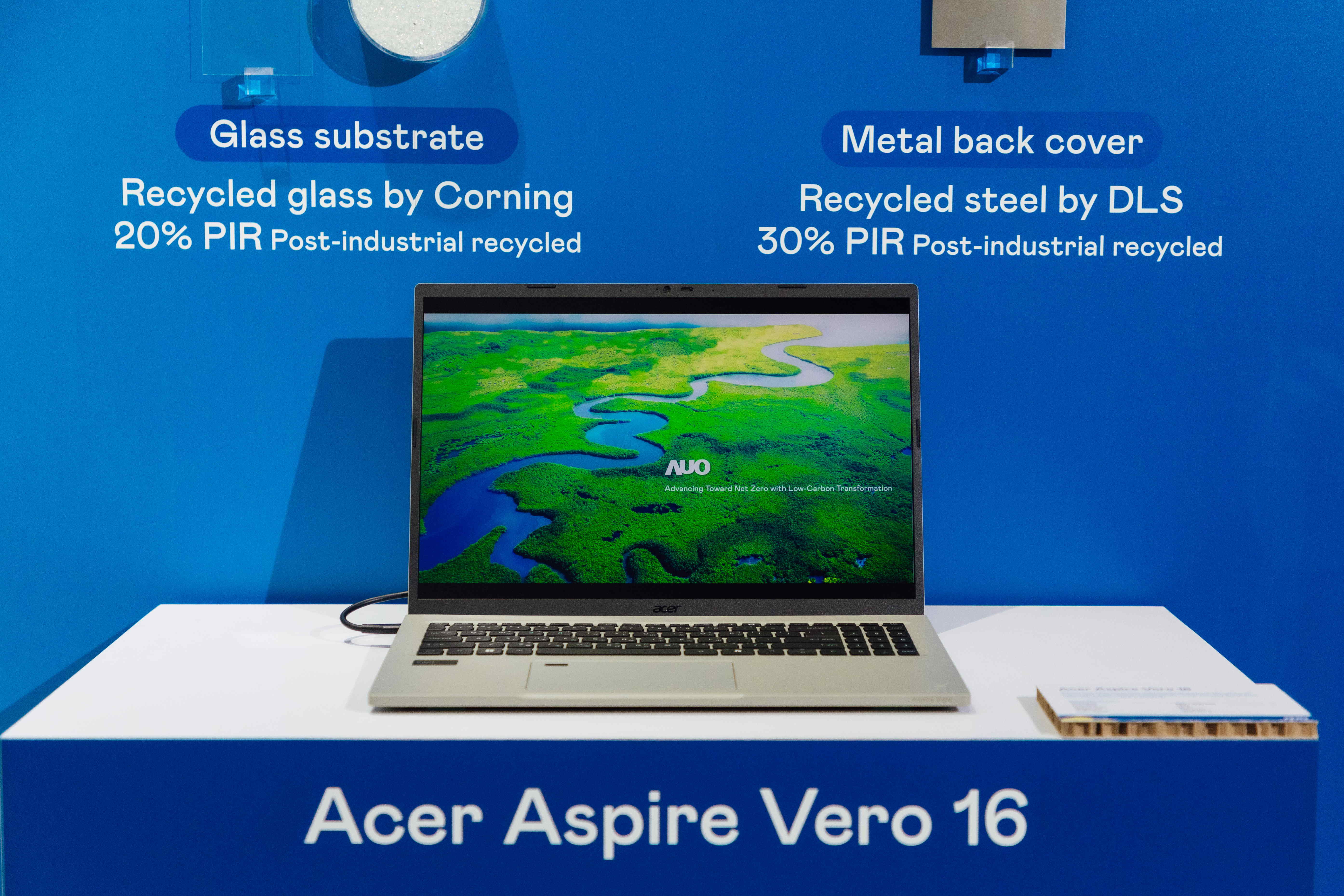 全球首款笔记型电脑采用友达100%绿电制造的面板,结合PCR外亦使用工业后回收材料(PIR),例如回收玻璃和金属,减少对环境的影响。